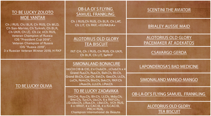 совладелец - Моисеева Е. д.р. 11.08.2021 Родословная FCI Юный чемпион России, Ch J RUS Юный чемпион РКФ, Ch J RKF Чемпион России, Ch RUS Чемпион РКФ, Ch RKF